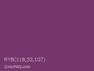 RYB 118,53,107 Color is a normal magenta color and the nearest color is Cosmic #76395d. Hex code #76356b and RGB value is rgb(118,53,107). In RGB color space, this color is composed of 46% red, 21% green, 42% blue, In CMYK color space, this color is composed of 0% cyan, 55% magenta, 9% yellow , 54% black , In HSL color space, this color has a hue angle of 310° , 38% saturation and 34% lightness.