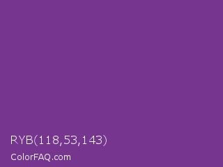 RYB 118,53,143 Color is a normal purple color and the nearest color is Vivid Violet #803790. Hex code #76358f and RGB value is rgb(118,53,143). In RGB color space, this color is composed of 46% red, 21% green, 56% blue, In CMYK color space, this color is composed of 17% cyan, 63% magenta, 0% yellow , 44% black , In HSL color space, this color has a hue angle of 283° , 46% saturation and 38% lightness.