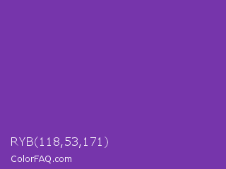 RYB 118,53,171 Color is a normal purple color and the nearest color is Grape #6f2da8. Hex code #7635ab and RGB value is rgb(118,53,171). In RGB color space, this color is composed of 46% red, 21% green, 67% blue, In CMYK color space, this color is composed of 31% cyan, 69% magenta, 0% yellow , 33% black , In HSL color space, this color has a hue angle of 273° , 53% saturation and 44% lightness.