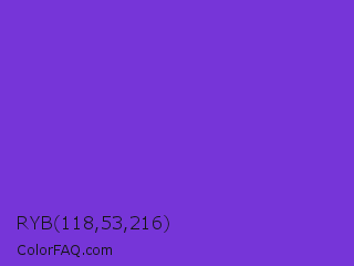RYB 118,53,216 Color is a normal violet color and the nearest color is Blue Violet #8a2be2. Hex code #7635d8 and RGB value is rgb(118,53,216). In RGB color space, this color is composed of 46% red, 21% green, 85% blue, In CMYK color space, this color is composed of 45% cyan, 75% magenta, 0% yellow , 15% black , In HSL color space, this color has a hue angle of 264° , 68% saturation and 53% lightness.