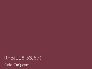 RYB 118,53,67 Color is a normal red color and the nearest color is Catawba #703642. Hex code #763543 and RGB value is rgb(118,53,67). In RGB color space, this color is composed of 46% red, 21% green, 26% blue, In CMYK color space, this color is composed of 0% cyan, 55% magenta, 43% yellow , 54% black , In HSL color space, this color has a hue angle of 347° , 38% saturation and 34% lightness.