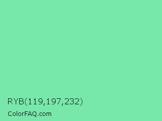 RYB 119,197,232 Color is a light green color and the nearest color is Medium Aquamarine #66ddaa. Hex code #77e8aa and RGB value is rgb(119,232,170). In RGB color space, this color is composed of 47% red, 91% green, 67% blue, In CMYK color space, this color is composed of 49% cyan, 0% magenta, 27% yellow , 9% black , In HSL color space, this color has a hue angle of 147° , 71% saturation and 69% lightness.