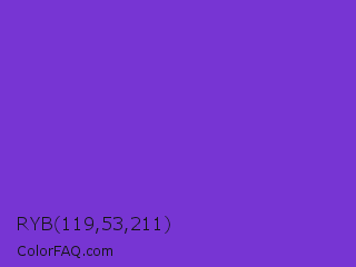 RYB 119,53,211 Color is a normal violet color and the nearest color is Blue Violet #8a2be2. Hex code #7735d3 and RGB value is rgb(119,53,211). In RGB color space, this color is composed of 47% red, 21% green, 83% blue, In CMYK color space, this color is composed of 44% cyan, 75% magenta, 0% yellow , 17% black , In HSL color space, this color has a hue angle of 265° , 64% saturation and 52% lightness.