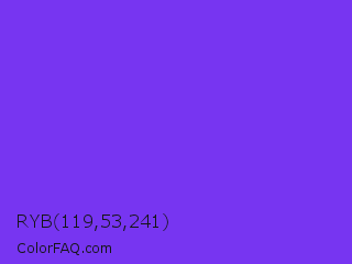 RYB 119,53,241 Color is a normal violet color and the nearest color is Blue Violet #8a2be2. Hex code #7735f1 and RGB value is rgb(119,53,241). In RGB color space, this color is composed of 47% red, 21% green, 95% blue, In CMYK color space, this color is composed of 51% cyan, 78% magenta, 0% yellow , 5% black , In HSL color space, this color has a hue angle of 261° , 87% saturation and 58% lightness.