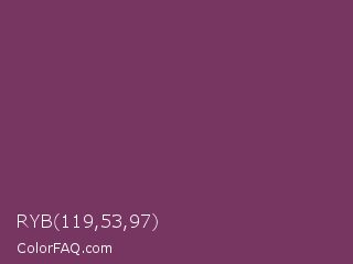 RYB 119,53,97 Color is a normal magenta color and the nearest color is Cosmic #76395d. Hex code #773561 and RGB value is rgb(119,53,97). In RGB color space, this color is composed of 47% red, 21% green, 38% blue, In CMYK color space, this color is composed of 0% cyan, 55% magenta, 18% yellow , 53% black , In HSL color space, this color has a hue angle of 320° , 38% saturation and 34% lightness.