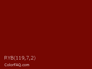 RYB 119,7,2 Color is a dark red color and the nearest color is Barn Red #7c0a02. Hex code #770702 and RGB value is rgb(119,7,2). In RGB color space, this color is composed of 47% red, 3% green, 1% blue, In CMYK color space, this color is composed of 0% cyan, 94% magenta, 98% yellow , 53% black , In HSL color space, this color has a hue angle of 3° , 97% saturation and 24% lightness.