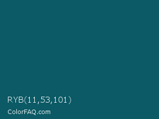 RYB 11,53,101 Color is a very dark cyan color and the nearest color is Deep Sea Green #095859. Hex code #0b5a65 and RGB value is rgb(11,90,101). In RGB color space, this color is composed of 4% red, 35% green, 40% blue, In CMYK color space, this color is composed of 89% cyan, 11% magenta, 0% yellow , 60% black , In HSL color space, this color has a hue angle of 187° , 80% saturation and 22% lightness.