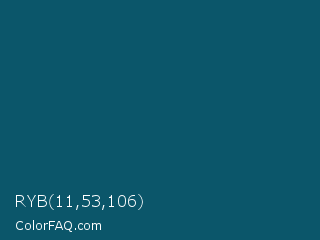 RYB 11,53,106 Color is a dark cyan color and the nearest color is Blue Stone #016162. Hex code #0b566a and RGB value is rgb(11,86,106). In RGB color space, this color is composed of 4% red, 34% green, 42% blue, In CMYK color space, this color is composed of 90% cyan, 19% magenta, 0% yellow , 58% black , In HSL color space, this color has a hue angle of 193° , 81% saturation and 23% lightness.