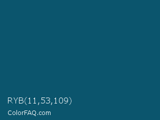 RYB 11,53,109 Color is a dark blue color and the nearest color is Chathams Blue #175579. Hex code #0b556d and RGB value is rgb(11,85,109). In RGB color space, this color is composed of 4% red, 33% green, 43% blue, In CMYK color space, this color is composed of 90% cyan, 22% magenta, 0% yellow , 57% black , In HSL color space, this color has a hue angle of 195° , 82% saturation and 24% lightness.