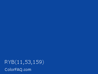 RYB 11,53,159 Color is a normal blue color and the nearest color is Yale Blue #0f4d92. Hex code #0b469f and RGB value is rgb(11,70,159). In RGB color space, this color is composed of 4% red, 27% green, 62% blue, In CMYK color space, this color is composed of 93% cyan, 56% magenta, 0% yellow , 38% black , In HSL color space, this color has a hue angle of 216° , 87% saturation and 33% lightness.