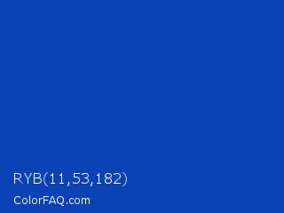 RYB 11,53,182 Color is a normal blue color and the nearest color is Absolute Zero #0048ba. Hex code #0b43b6 and RGB value is rgb(11,67,182). In RGB color space, this color is composed of 4% red, 26% green, 71% blue, In CMYK color space, this color is composed of 94% cyan, 63% magenta, 0% yellow , 29% black , In HSL color space, this color has a hue angle of 220° , 89% saturation and 38% lightness.