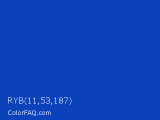 RYB 11,53,187 Color is a normal blue color and the nearest color is Absolute Zero #0048ba. Hex code #0b42bb and RGB value is rgb(11,66,187). In RGB color space, this color is composed of 4% red, 26% green, 73% blue, In CMYK color space, this color is composed of 94% cyan, 65% magenta, 0% yellow , 27% black , In HSL color space, this color has a hue angle of 221° , 89% saturation and 39% lightness.