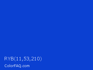RYB 11,53,210 Color is a normal blue color and the nearest color is Absolute Zero #0048ba. Hex code #0b40d2 and RGB value is rgb(11,64,210). In RGB color space, this color is composed of 4% red, 25% green, 82% blue, In CMYK color space, this color is composed of 95% cyan, 70% magenta, 0% yellow , 18% black , In HSL color space, this color has a hue angle of 224° , 90% saturation and 43% lightness.