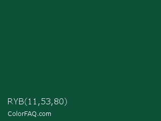 RYB 11,53,80 Color is a very dark green color and the nearest color is Sacramento State Green #00563f. Hex code #0b5037 and RGB value is rgb(11,80,55). In RGB color space, this color is composed of 4% red, 31% green, 22% blue, In CMYK color space, this color is composed of 86% cyan, 0% magenta, 31% yellow , 69% black , In HSL color space, this color has a hue angle of 158° , 76% saturation and 18% lightness.