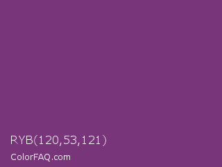 RYB 120,53,121 Color is a normal magenta color and the nearest color is Maximum Purple #733380. Hex code #783579 and RGB value is rgb(120,53,121). In RGB color space, this color is composed of 47% red, 21% green, 47% blue, In CMYK color space, this color is composed of 1% cyan, 56% magenta, 0% yellow , 53% black , In HSL color space, this color has a hue angle of 299° , 39% saturation and 34% lightness.