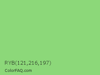 RYB 121,216,197 Color is a light green color and the nearest color is Pistachio #93c572. Hex code #8cd879 and RGB value is rgb(140,216,121). In RGB color space, this color is composed of 55% red, 85% green, 47% blue, In CMYK color space, this color is composed of 35% cyan, 0% magenta, 44% yellow , 15% black , In HSL color space, this color has a hue angle of 108° , 55% saturation and 66% lightness.