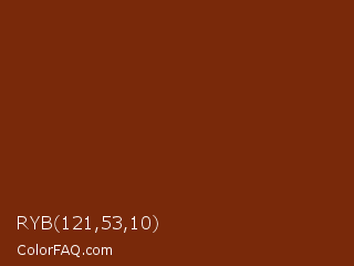 RYB 121,53,10 Color is a dark orange color and the nearest color is Smokey Topaz #832a0d. Hex code #79290a and RGB value is rgb(121,41,10). In RGB color space, this color is composed of 47% red, 16% green, 4% blue, In CMYK color space, this color is composed of 0% cyan, 66% magenta, 92% yellow , 53% black , In HSL color space, this color has a hue angle of 17° , 85% saturation and 26% lightness.