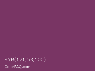 RYB 121,53,100 Color is a normal magenta color and the nearest color is Cosmic #76395d. Hex code #793564 and RGB value is rgb(121,53,100). In RGB color space, this color is composed of 47% red, 21% green, 39% blue, In CMYK color space, this color is composed of 0% cyan, 56% magenta, 17% yellow , 53% black , In HSL color space, this color has a hue angle of 319° , 39% saturation and 34% lightness.