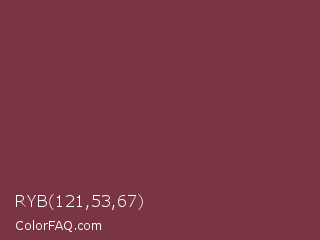 RYB 121,53,67 Color is a normal red color and the nearest color is Catawba #703642. Hex code #793543 and RGB value is rgb(121,53,67). In RGB color space, this color is composed of 47% red, 21% green, 26% blue, In CMYK color space, this color is composed of 0% cyan, 56% magenta, 45% yellow , 53% black , In HSL color space, this color has a hue angle of 348° , 39% saturation and 34% lightness.