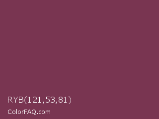 RYB 121,53,81 Color is a normal rose color and the nearest color is Cosmic #76395d. Hex code #793551 and RGB value is rgb(121,53,81). In RGB color space, this color is composed of 47% red, 21% green, 32% blue, In CMYK color space, this color is composed of 0% cyan, 56% magenta, 33% yellow , 53% black , In HSL color space, this color has a hue angle of 335° , 39% saturation and 34% lightness.