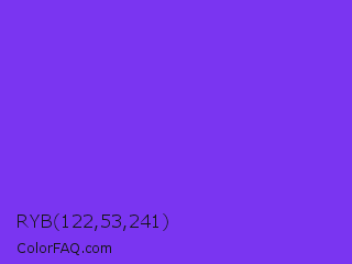RYB 122,53,241 Color is a normal violet color and the nearest color is Blue Violet #8a2be2. Hex code #7a35f1 and RGB value is rgb(122,53,241). In RGB color space, this color is composed of 48% red, 21% green, 95% blue, In CMYK color space, this color is composed of 49% cyan, 78% magenta, 0% yellow , 5% black , In HSL color space, this color has a hue angle of 262° , 87% saturation and 58% lightness.
