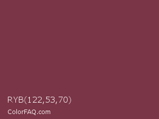 RYB 122,53,70 Color is a normal red color and the nearest color is Catawba #703642. Hex code #7a3546 and RGB value is rgb(122,53,70). In RGB color space, this color is composed of 48% red, 21% green, 27% blue, In CMYK color space, this color is composed of 0% cyan, 57% magenta, 43% yellow , 52% black , In HSL color space, this color has a hue angle of 345° , 39% saturation and 34% lightness.