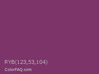RYB 123,53,104 Color is a normal magenta color and the nearest color is Cosmic #76395d. Hex code #7b3568 and RGB value is rgb(123,53,104). In RGB color space, this color is composed of 48% red, 21% green, 41% blue, In CMYK color space, this color is composed of 0% cyan, 57% magenta, 15% yellow , 52% black , In HSL color space, this color has a hue angle of 316° , 40% saturation and 35% lightness.