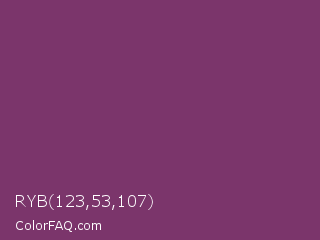 RYB 123,53,107 Color is a normal magenta color and the nearest color is Cosmic #76395d. Hex code #7b356b and RGB value is rgb(123,53,107). In RGB color space, this color is composed of 48% red, 21% green, 42% blue, In CMYK color space, this color is composed of 0% cyan, 57% magenta, 13% yellow , 52% black , In HSL color space, this color has a hue angle of 314° , 40% saturation and 35% lightness.