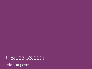 RYB 123,53,111 Color is a normal magenta color and the nearest color is Razzmic Berry Crayola #843179. Hex code #7b356f and RGB value is rgb(123,53,111). In RGB color space, this color is composed of 48% red, 21% green, 44% blue, In CMYK color space, this color is composed of 0% cyan, 57% magenta, 10% yellow , 52% black , In HSL color space, this color has a hue angle of 310° , 40% saturation and 35% lightness.