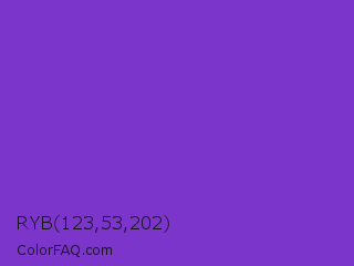 RYB 123,53,202 Color is a normal violet color and the nearest color is Purple Heart Crayola #652dc1. Hex code #7b35ca and RGB value is rgb(123,53,202). In RGB color space, this color is composed of 48% red, 21% green, 79% blue, In CMYK color space, this color is composed of 39% cyan, 74% magenta, 0% yellow , 21% black , In HSL color space, this color has a hue angle of 268° , 58% saturation and 50% lightness.