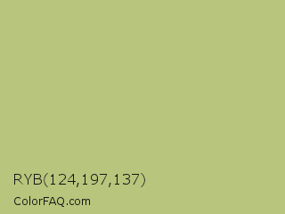 RYB 124,197,137 Color is a light lime color and the nearest color is Misty Moss #bbb477. Hex code #b8c57c and RGB value is rgb(184,197,124). In RGB color space, this color is composed of 72% red, 77% green, 49% blue, In CMYK color space, this color is composed of 7% cyan, 0% magenta, 37% yellow , 23% black , In HSL color space, this color has a hue angle of 71° , 39% saturation and 63% lightness.