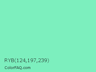 RYB 124,197,239 Color is a light green color and the nearest color is Bermuda #7dd8c6. Hex code #7cefbe and RGB value is rgb(124,239,190). In RGB color space, this color is composed of 49% red, 94% green, 75% blue, In CMYK color space, this color is composed of 48% cyan, 0% magenta, 21% yellow , 6% black , In HSL color space, this color has a hue angle of 154° , 78% saturation and 71% lightness.