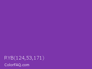 RYB 124,53,171 Color is a normal purple color and the nearest color is Grape #6f2da8. Hex code #7c35ab and RGB value is rgb(124,53,171). In RGB color space, this color is composed of 49% red, 21% green, 67% blue, In CMYK color space, this color is composed of 27% cyan, 69% magenta, 0% yellow , 33% black , In HSL color space, this color has a hue angle of 276° , 53% saturation and 44% lightness.
