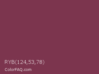 RYB 124,53,78 Color is a normal rose color and the nearest color is Camelot #893456. Hex code #7c354e and RGB value is rgb(124,53,78). In RGB color space, this color is composed of 49% red, 21% green, 31% blue, In CMYK color space, this color is composed of 0% cyan, 57% magenta, 37% yellow , 51% black , In HSL color space, this color has a hue angle of 339° , 40% saturation and 35% lightness.