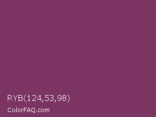RYB 124,53,98 Color is a normal magenta color and the nearest color is Cosmic #76395d. Hex code #7c3562 and RGB value is rgb(124,53,98). In RGB color space, this color is composed of 49% red, 21% green, 38% blue, In CMYK color space, this color is composed of 0% cyan, 57% magenta, 21% yellow , 51% black , In HSL color space, this color has a hue angle of 322° , 40% saturation and 35% lightness.