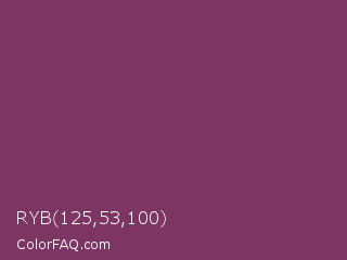 RYB 125,53,100 Color is a normal magenta color and the nearest color is Cosmic #76395d. Hex code #7d3564 and RGB value is rgb(125,53,100). In RGB color space, this color is composed of 49% red, 21% green, 39% blue, In CMYK color space, this color is composed of 0% cyan, 58% magenta, 20% yellow , 51% black , In HSL color space, this color has a hue angle of 321° , 40% saturation and 35% lightness.