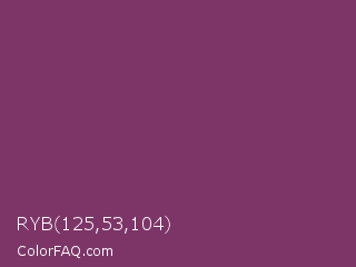 RYB 125,53,104 Color is a normal magenta color and the nearest color is Boysenberry #873260. Hex code #7d3568 and RGB value is rgb(125,53,104). In RGB color space, this color is composed of 49% red, 21% green, 41% blue, In CMYK color space, this color is composed of 0% cyan, 58% magenta, 17% yellow , 51% black , In HSL color space, this color has a hue angle of 318° , 40% saturation and 35% lightness.