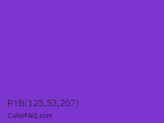 RYB 125,53,207 Color is a normal violet color and the nearest color is Blue Violet #8a2be2. Hex code #7d35cf and RGB value is rgb(125,53,207). In RGB color space, this color is composed of 49% red, 21% green, 81% blue, In CMYK color space, this color is composed of 40% cyan, 74% magenta, 0% yellow , 19% black , In HSL color space, this color has a hue angle of 268° , 62% saturation and 51% lightness.