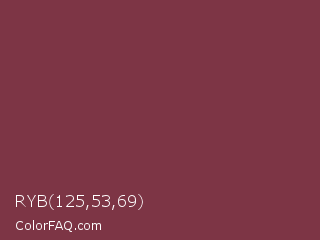 RYB 125,53,69 Color is a normal red color and the nearest color is Solid Pink #893843. Hex code #7d3545 and RGB value is rgb(125,53,69). In RGB color space, this color is composed of 49% red, 21% green, 27% blue, In CMYK color space, this color is composed of 0% cyan, 58% magenta, 45% yellow , 51% black , In HSL color space, this color has a hue angle of 347° , 40% saturation and 35% lightness.