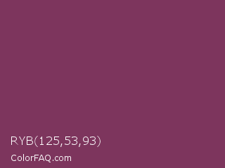 RYB 125,53,93 Color is a normal magenta color and the nearest color is Cosmic #76395d. Hex code #7d355d and RGB value is rgb(125,53,93). In RGB color space, this color is composed of 49% red, 21% green, 36% blue, In CMYK color space, this color is composed of 0% cyan, 58% magenta, 26% yellow , 51% black , In HSL color space, this color has a hue angle of 327° , 40% saturation and 35% lightness.