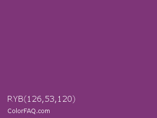 RYB 126,53,120 Color is a normal magenta color and the nearest color is Razzmic Berry Crayola #843179. Hex code #7e3578 and RGB value is rgb(126,53,120). In RGB color space, this color is composed of 49% red, 21% green, 47% blue, In CMYK color space, this color is composed of 0% cyan, 58% magenta, 5% yellow , 51% black , In HSL color space, this color has a hue angle of 305° , 41% saturation and 35% lightness.