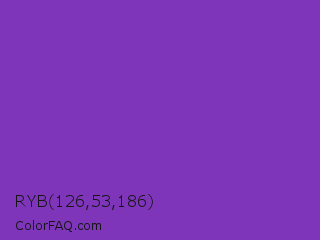 RYB 126,53,186 Color is a normal purple color and the nearest color is Grape #6f2da8. Hex code #7e35ba and RGB value is rgb(126,53,186). In RGB color space, this color is composed of 49% red, 21% green, 73% blue, In CMYK color space, this color is composed of 32% cyan, 72% magenta, 0% yellow , 27% black , In HSL color space, this color has a hue angle of 273° , 56% saturation and 47% lightness.
