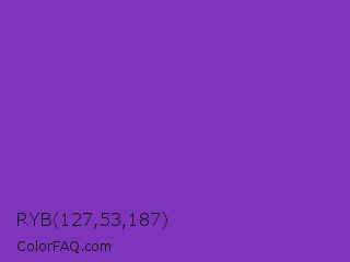 RYB 127,53,187 Color is a normal purple color and the nearest color is Grape #6f2da8. Hex code #7f35bb and RGB value is rgb(127,53,187). In RGB color space, this color is composed of 50% red, 21% green, 73% blue, In CMYK color space, this color is composed of 32% cyan, 72% magenta, 0% yellow , 27% black , In HSL color space, this color has a hue angle of 273° , 56% saturation and 47% lightness.
