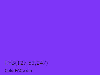 RYB 127,53,247 Color is a normal violet color and the nearest color is Blue Violet #8a2be2. Hex code #7f35f7 and RGB value is rgb(127,53,247). In RGB color space, this color is composed of 50% red, 21% green, 97% blue, In CMYK color space, this color is composed of 49% cyan, 79% magenta, 0% yellow , 3% black , In HSL color space, this color has a hue angle of 263° , 92% saturation and 59% lightness.