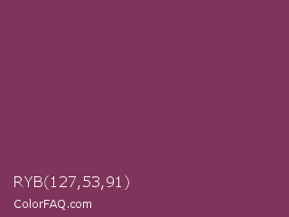 RYB 127,53,91 Color is a normal rose color and the nearest color is Boysenberry #873260. Hex code #7f355b and RGB value is rgb(127,53,91). In RGB color space, this color is composed of 50% red, 21% green, 36% blue, In CMYK color space, this color is composed of 0% cyan, 58% magenta, 28% yellow , 50% black , In HSL color space, this color has a hue angle of 329° , 41% saturation and 35% lightness.