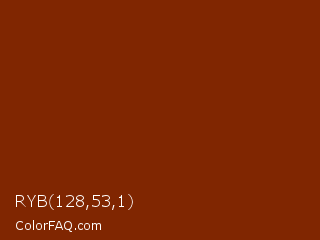 RYB 128,53,1 Color is a dark orange color and the nearest color is Kenyan Copper #7c1c05. Hex code #802601 and RGB value is rgb(128,38,1). In RGB color space, this color is composed of 50% red, 15% green, 0% blue, In CMYK color space, this color is composed of 0% cyan, 70% magenta, 99% yellow , 50% black , In HSL color space, this color has a hue angle of 17° , 98% saturation and 25% lightness.
