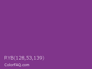 RYB 128,53,139 Color is a normal magenta color and the nearest color is Vivid Violet #803790. Hex code #80358b and RGB value is rgb(128,53,139). In RGB color space, this color is composed of 50% red, 21% green, 55% blue, In CMYK color space, this color is composed of 8% cyan, 62% magenta, 0% yellow , 45% black , In HSL color space, this color has a hue angle of 292° , 45% saturation and 38% lightness.