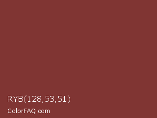 RYB 128,53,51 Color is a normal red color and the nearest color is Lotus #863c3c. Hex code #803533 and RGB value is rgb(128,53,51). In RGB color space, this color is composed of 50% red, 21% green, 20% blue, In CMYK color space, this color is composed of 0% cyan, 59% magenta, 60% yellow , 50% black , In HSL color space, this color has a hue angle of 2° , 43% saturation and 35% lightness.