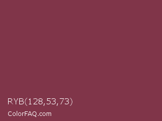RYB 128,53,73 Color is a normal rose color and the nearest color is Solid Pink #893843. Hex code #803549 and RGB value is rgb(128,53,73). In RGB color space, this color is composed of 50% red, 21% green, 29% blue, In CMYK color space, this color is composed of 0% cyan, 59% magenta, 43% yellow , 50% black , In HSL color space, this color has a hue angle of 344° , 41% saturation and 35% lightness.