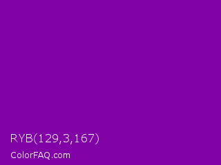 RYB 129,3,167 Color is a normal purple color and the nearest color is Violet RYB #8601af. Hex code #8103a7 and RGB value is rgb(129,3,167). In RGB color space, this color is composed of 51% red, 1% green, 65% blue, In CMYK color space, this color is composed of 23% cyan, 98% magenta, 0% yellow , 35% black , In HSL color space, this color has a hue angle of 286° , 96% saturation and 33% lightness.